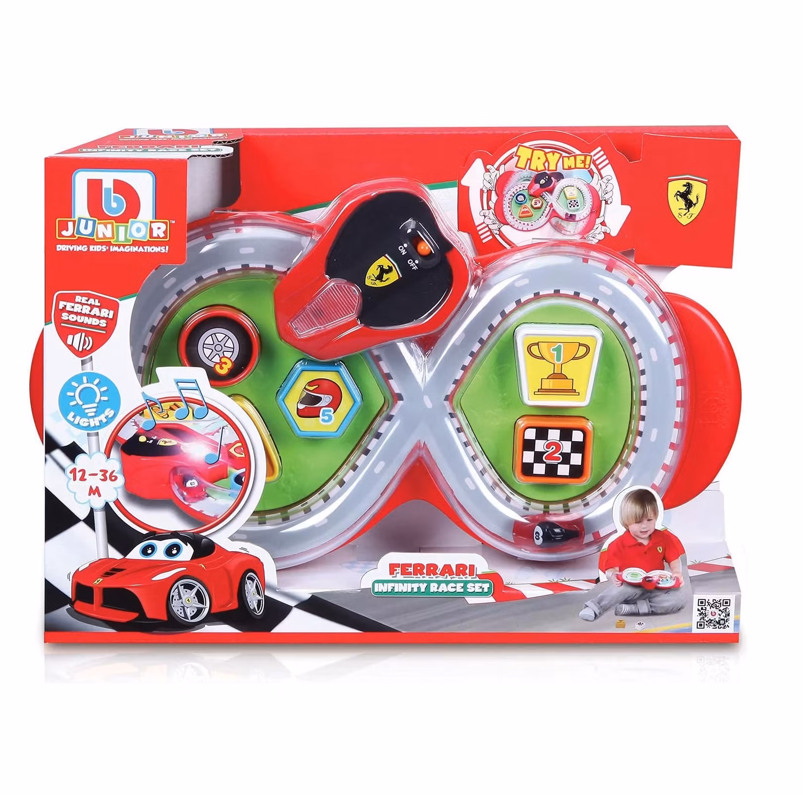 Infinity race set för barn mellan 12 och 36 månader. Ger i från sig ljud och lyser samt så är de 5 formerna avtagbara. Drivs på 3 x AAA batterier.