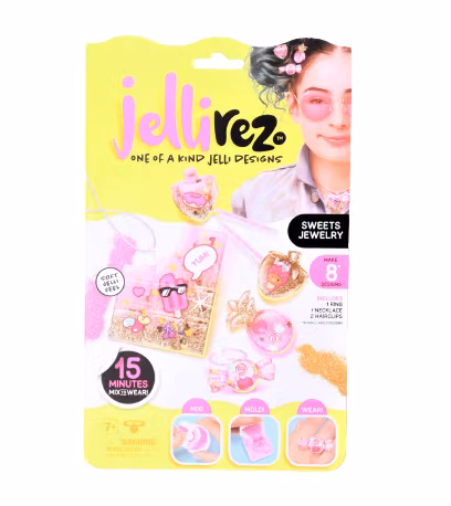 Gör egna gelésmycken med det här JelliRez pysselsetet. Blanda vätskorna, tillsätt glitter och låt dem stelna i formarna. När de stelnat kan du göra halsband, hårspännen, ring mm.