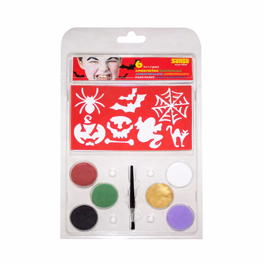 Från Sense kommer den perfekta mallen inför halloween kalaset, det finns 6 olika färger att välja mellan. Det ingår även en mindre pensel. Måla enkel barnens ansikten med hjälp av mallen, lite pumpor, spindlar eller varför inte fladdermöss!