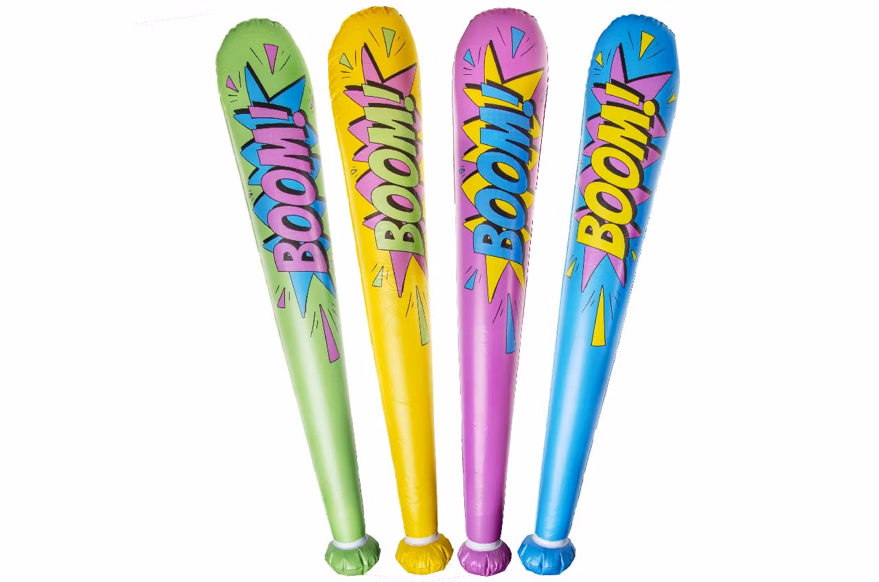 Ett 85cm långt uppblåsbart baseball racket med texten BOOM! på. Blås upp den med munnen eller en pump.