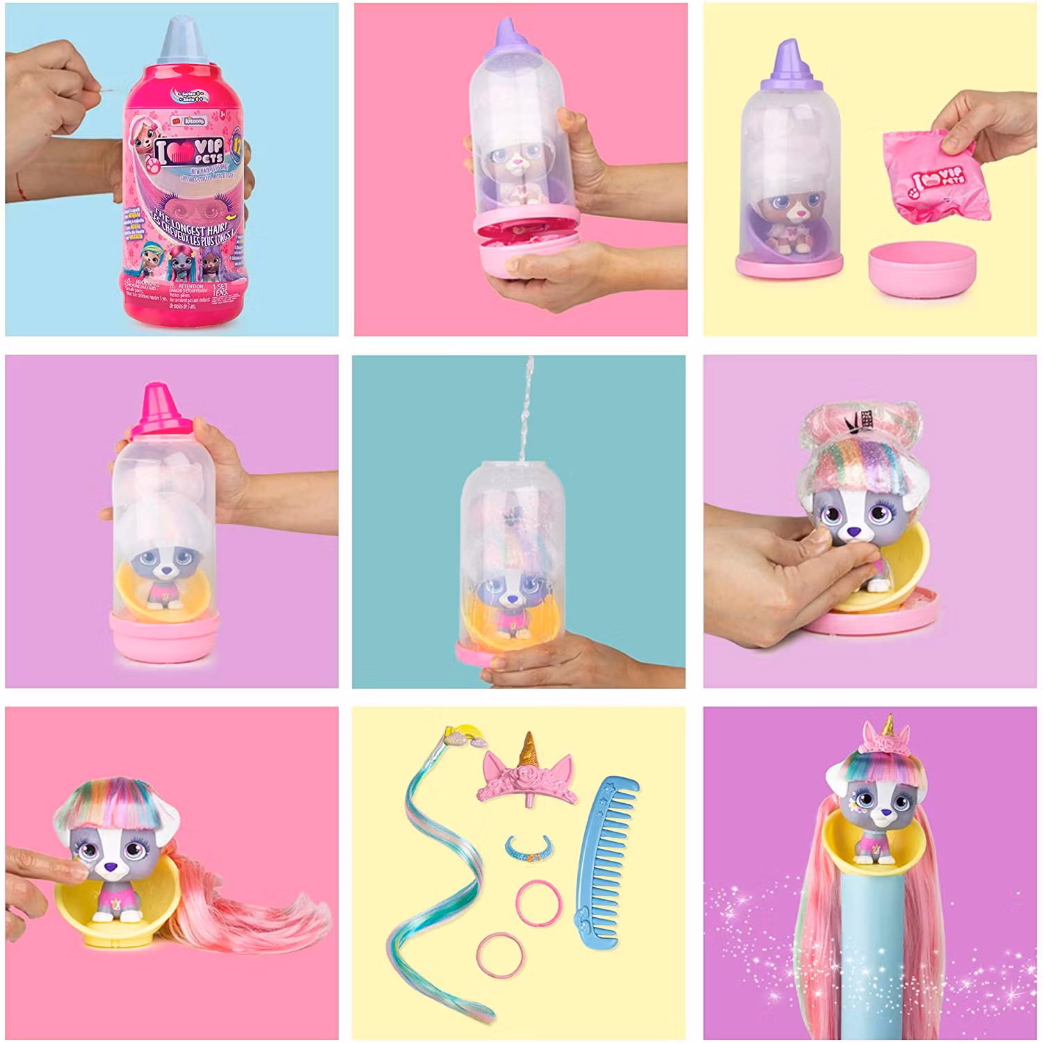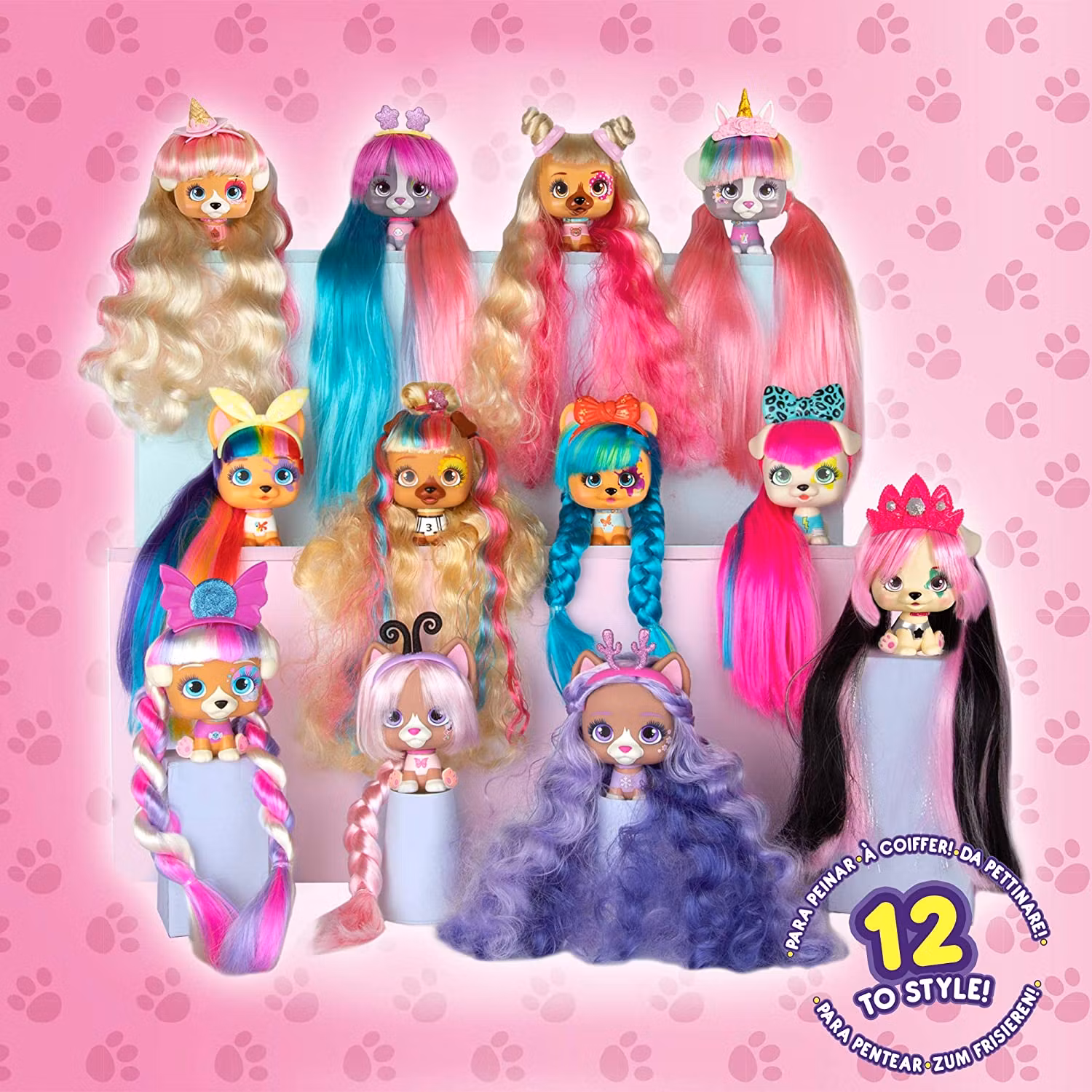 VIP Husdjur är fashionabla hundar, med mycket långt hår, 30 cm hår. 6 karaktärer, med olika personligheter och livsstilar, förenade med en och enda passion: hår. De gillar att visa upp det mest mångsidiga och coola utseendet beroende på tillfälle. För att upptäcka dina VIP-husdjur, tvätta håret med vatten och använd de medföljande tillbehören för att skapa rätt frisyr för varje tillfälle. Varje Vip Pets har sin egen personliga stol för att kamma den bekvämt.