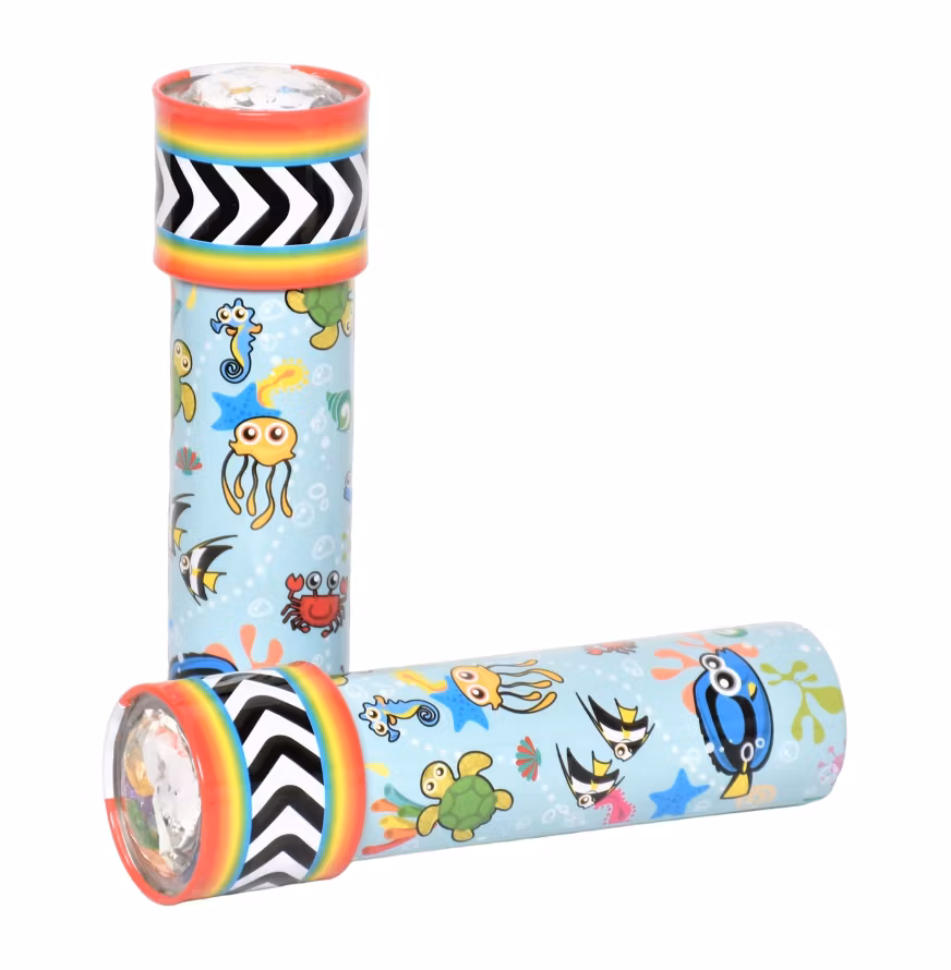 Ett bländande och intressanta mönster skapas i det här färgglada kalejdoskopet, och fiskar pryder utsidan.