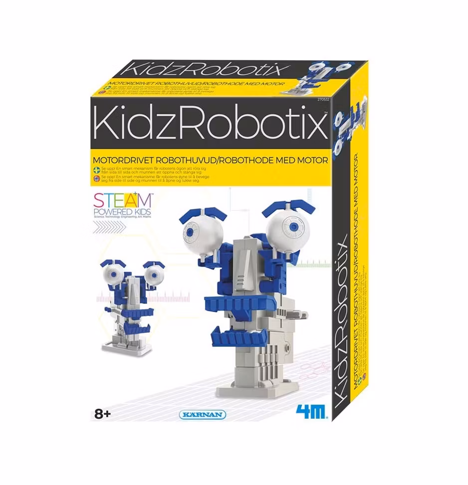 Kidzrobotix - Robothuvud är det ultimata sättet att utforska konsten att skapa robotar! Med 4M motordrivet robothuvud kan du bygga ditt eget robotansikte och se dess coola egenskaper. Ögonen rör sig från sida till sida och munnen kan öppnas och stängas! Det är en häftig, inspirerande upplevelse som kommer att få dina barn att le och lära sig samtidigt. CE-märkt och rekommenderad för barn 8 år och äldre, Kidzrobotix - Robothuvud är ett perfekt sätt att väcka fantasin hos dina barn. Förpackningen är 27,5 x 20,5 x 6 cm och innehåller enbart plastmaterial. Rekommenderas ej för barn under 3 år, eftersom den innehåller smådelar som kan vara en kvävningsrisk. Låt dina barns kreativitet flöda med