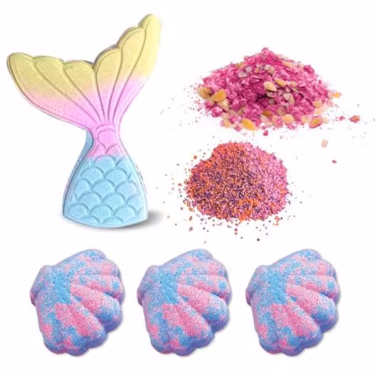 Mermazing Bath Set – för en magisk badstund! Med Mermazing Badsets underbara badprodukter kommer du att njuta av en härlig och mysig badstund. Fyll badkaret med badbomber, badpulver och badsalt som alla doftar gudomligt av frukt. Förpackningen innehåller även ett sjöjungfru-tema som passar perfekt för alla som älskar det fantastiska havstemat. Förpackningen innehåller: 1 Fena badbomb med kokosnötsdoft, 3 minibadbomber med blåbärsdoft, Badpulver med körsbärsdoft och vitamin E samt badsalt. Låt Mermazing Bath Set ta dig till ett magiskt hav och njut av en otroligt ljuvlig badstund!