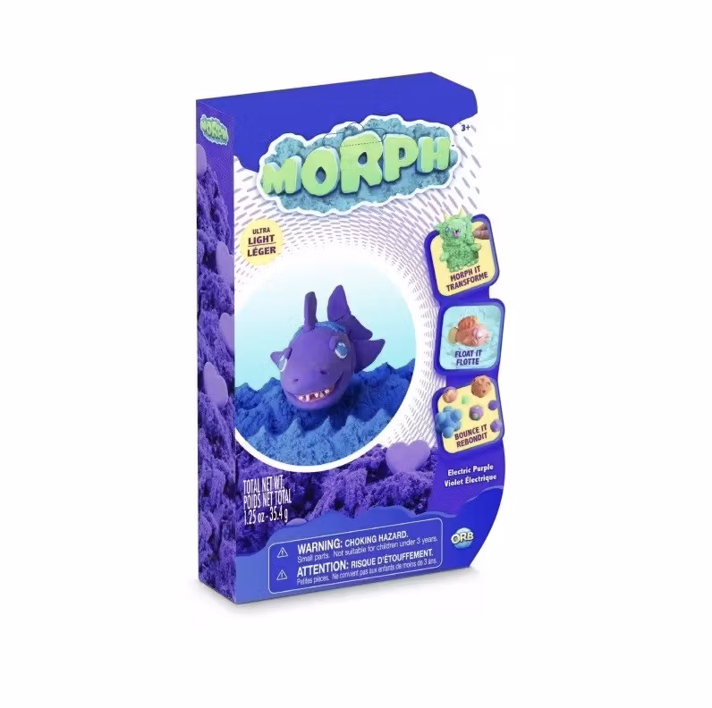 Magisk lera, den lila ultimata lerdegen som kan formas och bearbetas till nästan vilken form som helst. Det magiska med morph är att den aldrig torkar vilket innebär att den kan knådas och skulptera i nya kreationer utan att den blir smulig. Leran är väldigt lätt och eftersom att den är väldigt flexibel kan ett barnet till exempel göra sin en egen boll och leka med den. Efter det kanske barnet om hen vill skapa något annat som till exempel en båt eller fisk som går bra att ha i vatten eftersom att leran flyter. Morph Magisk lera är en kreativ typ av lerdeg förobegänsat skapande.