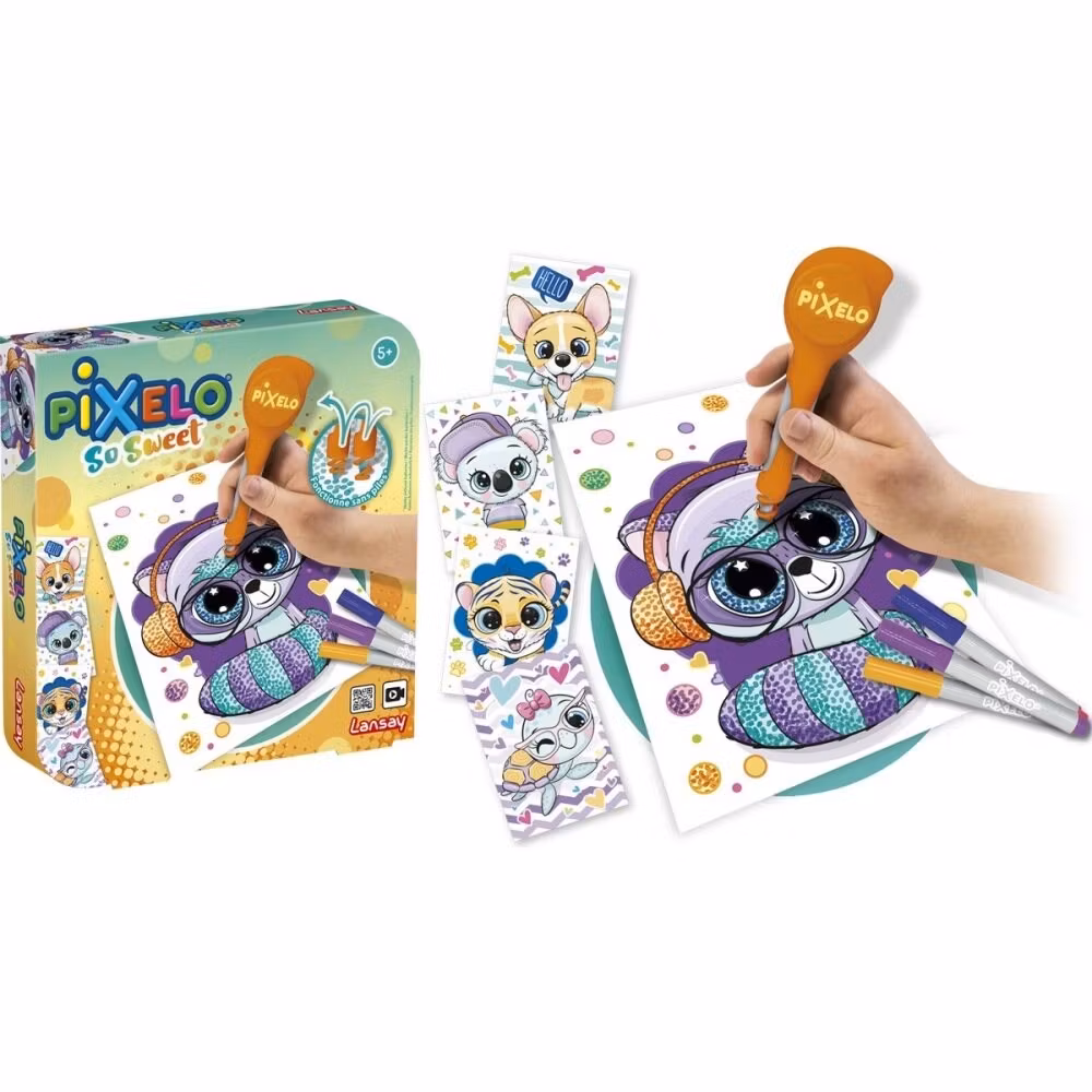 Pixelo So Sweet är den perfekta tuschpennan för alla kreativa små händer! Med sin unika fjädrande effekt kan du skapa de mest fantastiska motiv och mönster. Det är riktigt roligt att leka med prickar lite här och där och få fram spännande effekter. Pixelo So Sweet är det ultimata setet för alla barn som vill uttrycka sig kreativt. Setet innehåller 1 Pixelo Bounce penna, 5 ritningar av bedårande djur och 4 färgmarkörer. Med detta set kan du skapa de coolaste bilder som du bara kan tänka dig! Vad väntar du på? Skapa de snyggaste bilderna med Pixelo So Sweet! Men glöm inte: Ej lämplig för barn under sex år!