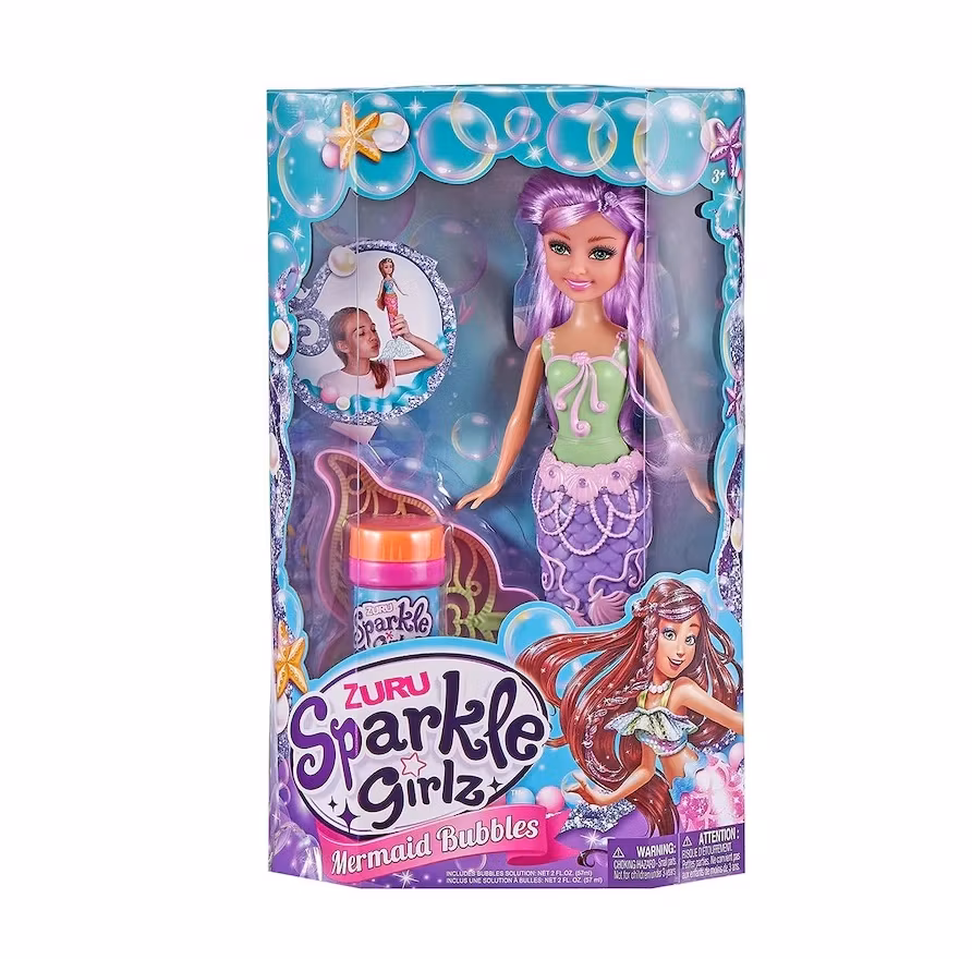 Skickas i slumpmässig färg, dockans färg är den samma som på bilden men övriga delar finns i olika färger. Utöver dockan medföljer bubbellösning och en lite skål i form av en sjöjungfrunstjärt.