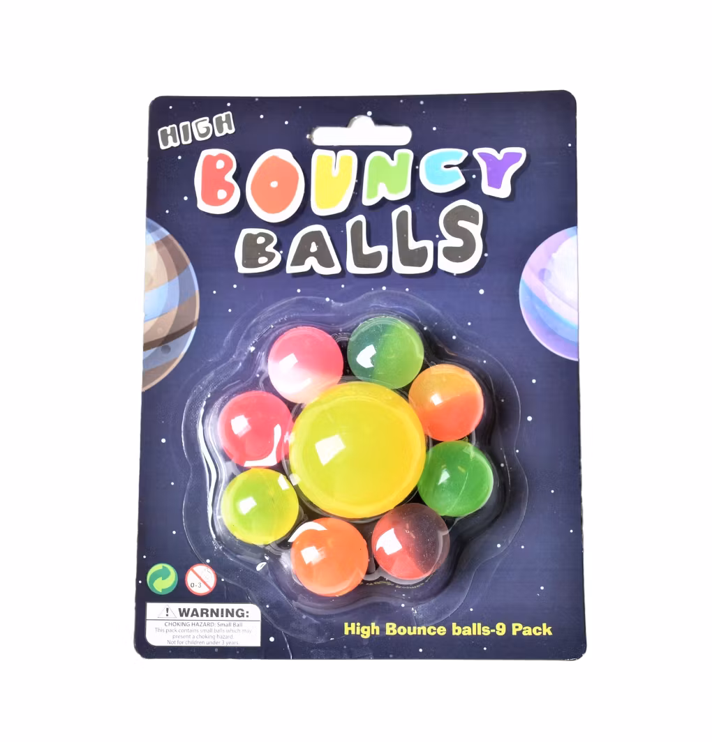 Förpackningen innehåller en stor studsboll och åtta små studsbollar i olika färger.