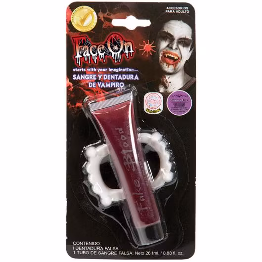 Vampyrtänder och teaterblod – Förvandla dig till en riktig skräckvarelse! Kusligt set med allt du behöver för att bli till en vampyr med super vassa vampyrtänder. Vampyrtänder av plast samt en tub med 26 ml rött låtsasblod. Blodet kan appliceras direkt från tuben och tvättas enkelt bort med tvål och vatten. Få den ultimata vampyrlooken med Teaterblod med Vampyrtänder! Med detta set kan du förvandla dig till en riktig skräckvarelse på nolltid.